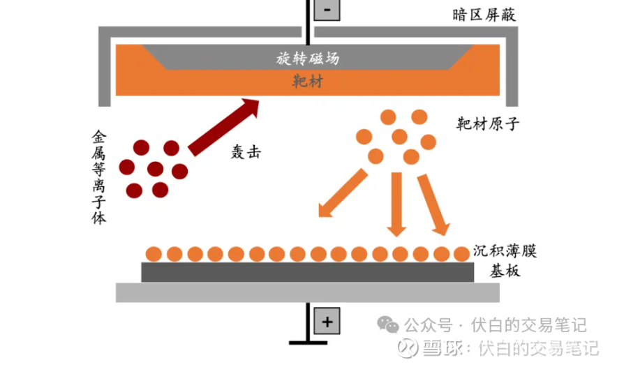 磁控溅射工艺流程:真空环境准备→等离子体产生(氩离子)→靶材原子溅射→薄膜沉积。