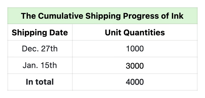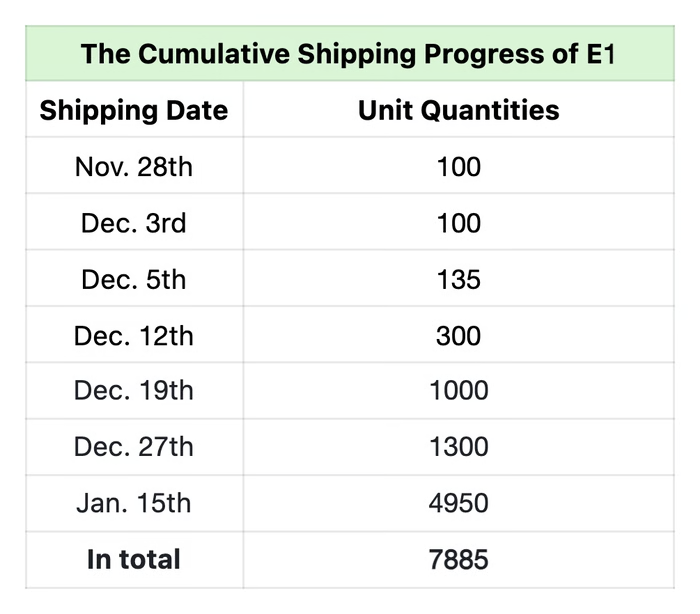 我们想与大家分享本周的发货情况。总共有 4,950 台 E1 设备和 3,000 套墨水已从工厂打包发货。