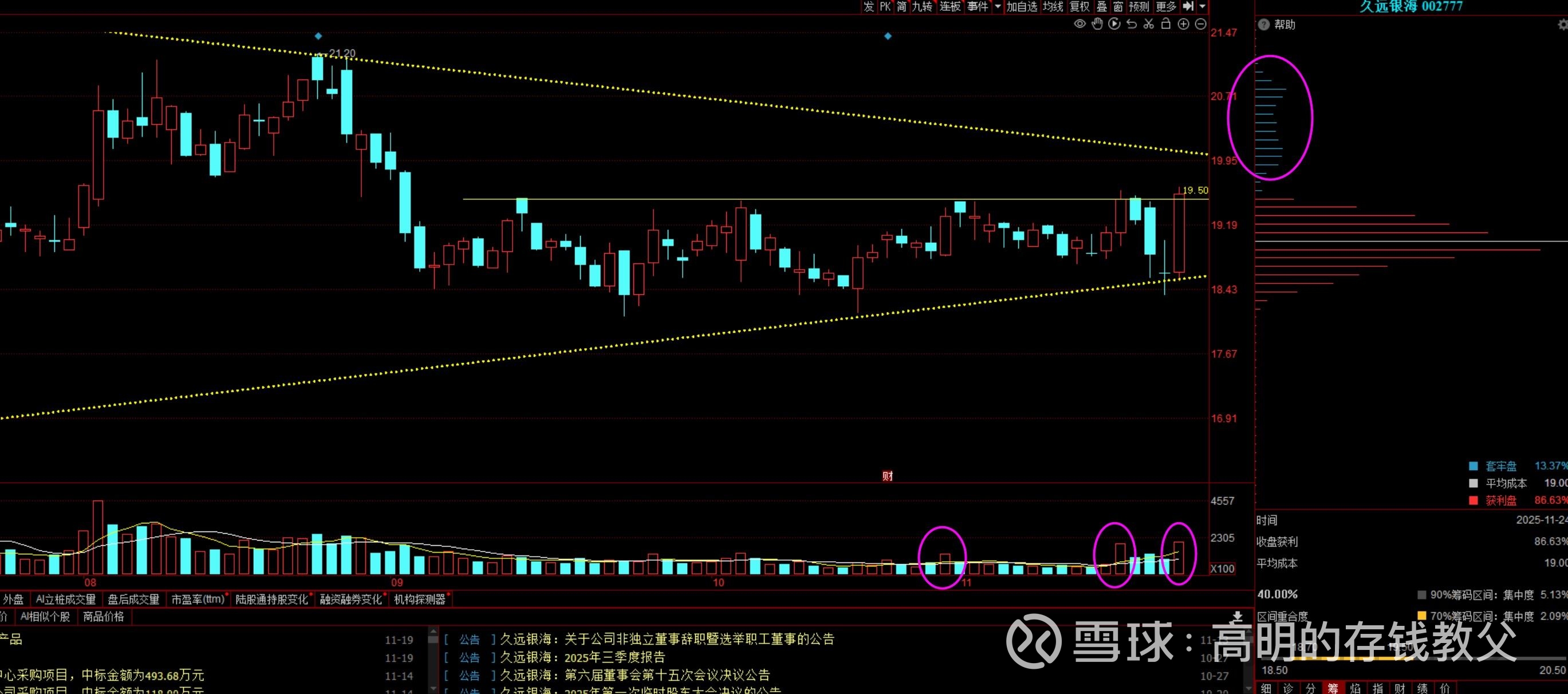 3、从日k线上看,昨天一根中阳线突破了近期的平台,但是横盘整理的时间不到3个月,时间还不略显不够,主力筹码收集的可能差点意思。这从筹码峰上可以看出来,上方还有大约13%的套牢筹码不肯割肉。如果再横盘震荡一段时间,继续洗洗筹码,就差不多。(我真是咸吃萝卜淡操心!)