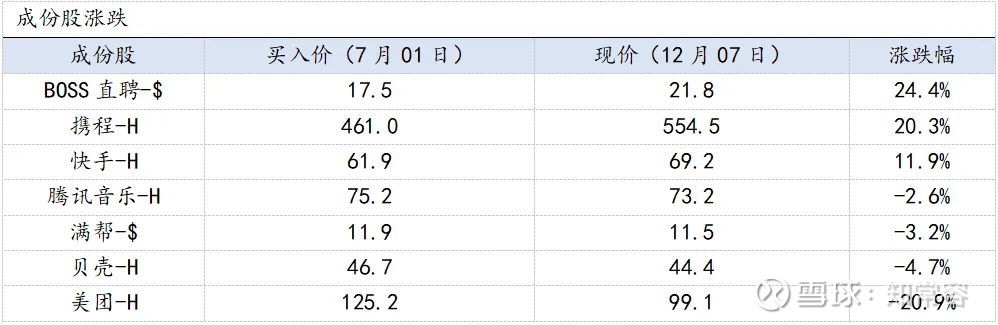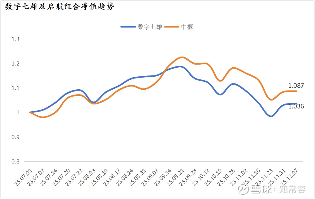 7月1日-12月7日,数字七雄净值为1.036,同期中概互联网指数(H11136)净值为1.087,数字七雄组合净值略微跑输中概。