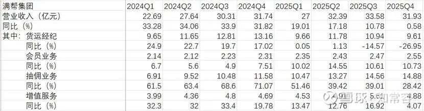 2025年Q4满帮集团营收同比增速明显放缓,主要是除了会员业务外,其他3项业务要么同比增速放缓,要么同比降幅扩大。