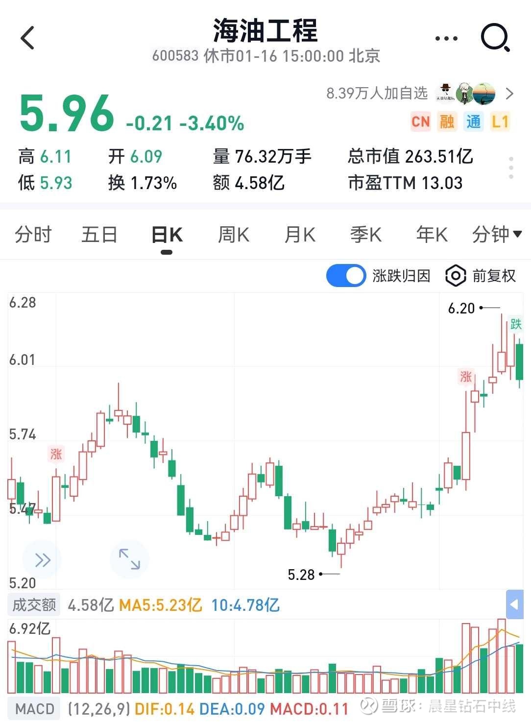 截至2026年1月16日,股价5.96元(-3.40%),总市值263.51亿元,市盈率TTM13.03。近期震荡上行后回调,近60日有涨有跌,主力资金波动,支撑位关注5.8元,压力位6.2元,订单落地与油价波动为主要催化因素。