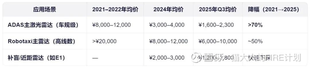2025年车规激光雷达价格进入200美元区间,预计明年车规激光雷达价格基本会延激光雷达自己的"摩尔定律"继续线性降价20%-25%左右;然后基本进入价格稳定区间,从“市场定价”转向“成本定价”,2027年之后成本下降速度会开始放缓,后期降本则依赖芯片迭代、工艺优化、生产良率提升,这些是渐进式的,效果不会立竿见影。