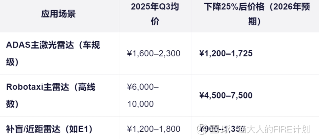 对应2026年的激光雷达价格预期(在Q3均价基础上下降25%):