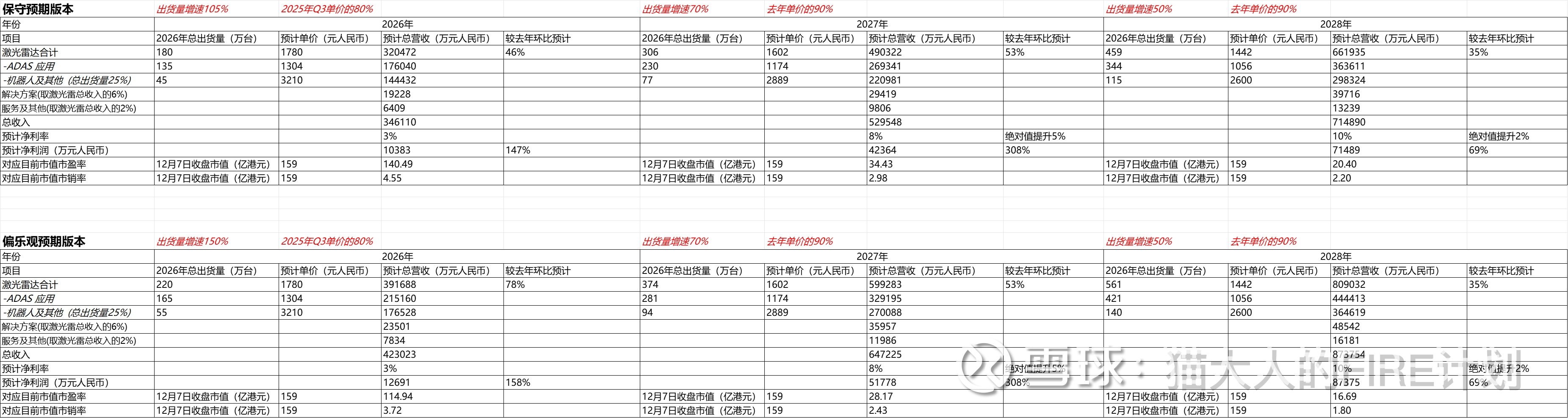 我能很明确的说,他们肯定预估少了。低估了产品降价和智驾、机器人等需求的增长爆发。 最简单的证伪逻辑:如果就按速腾维持11月出货量15万不变,2026年基本出货量就180万左右;禾赛对应的出货规模也在180-200万左右;激光雷达基本是按订单投产的,光这2个公司的总出货量就接近400万;