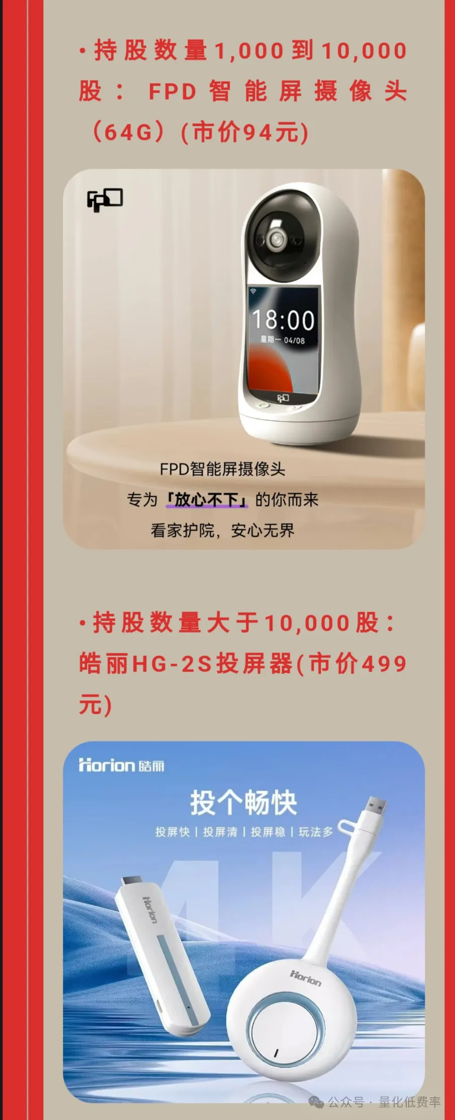 持仓1000股到10000股,可以领取智能屏摄像头;