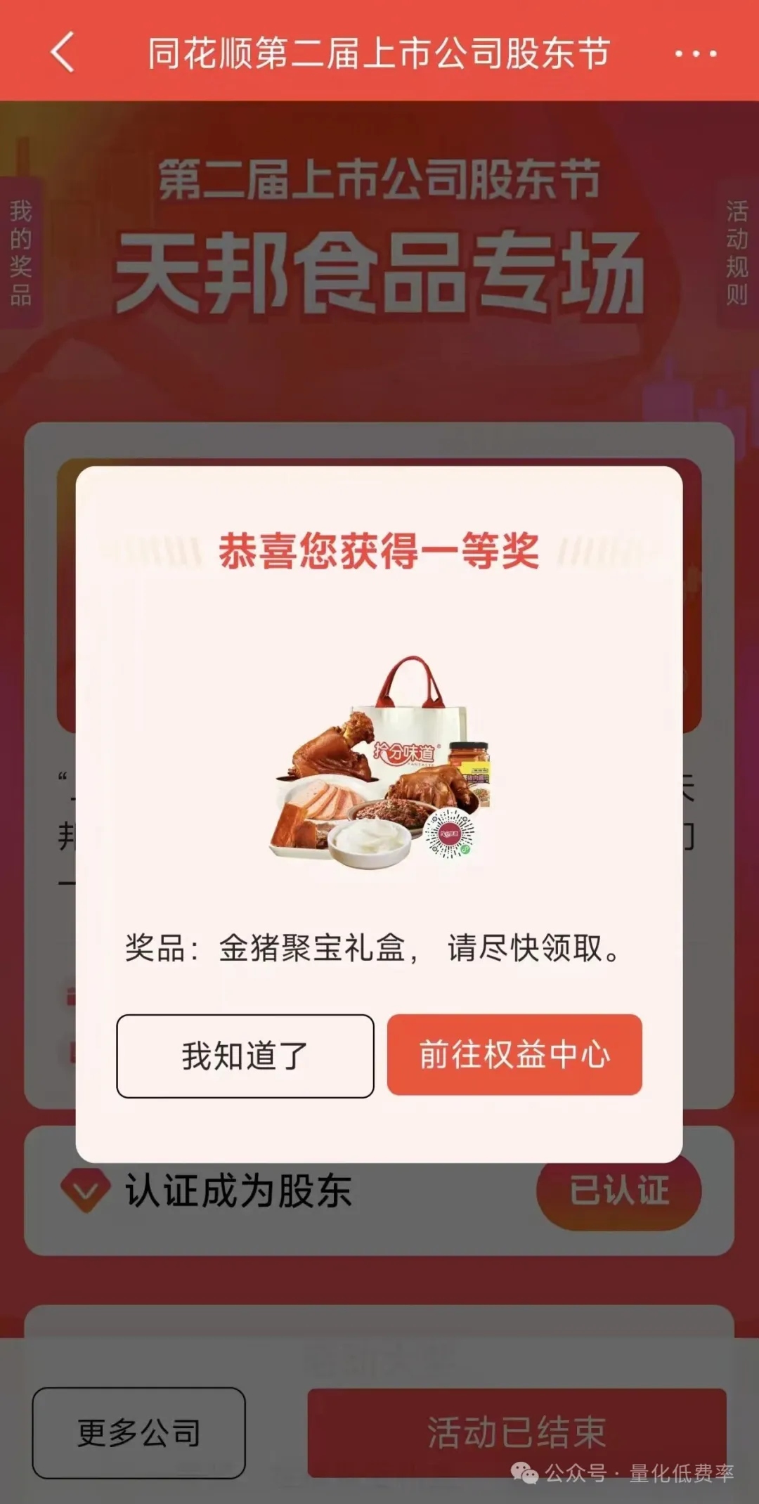 在10月中旬,天邦食品(002124)联合同花顺举办的股东节送实物礼品,而且它没有持仓要求,不过要抽奖才有奖品,不过貌似很容易中。