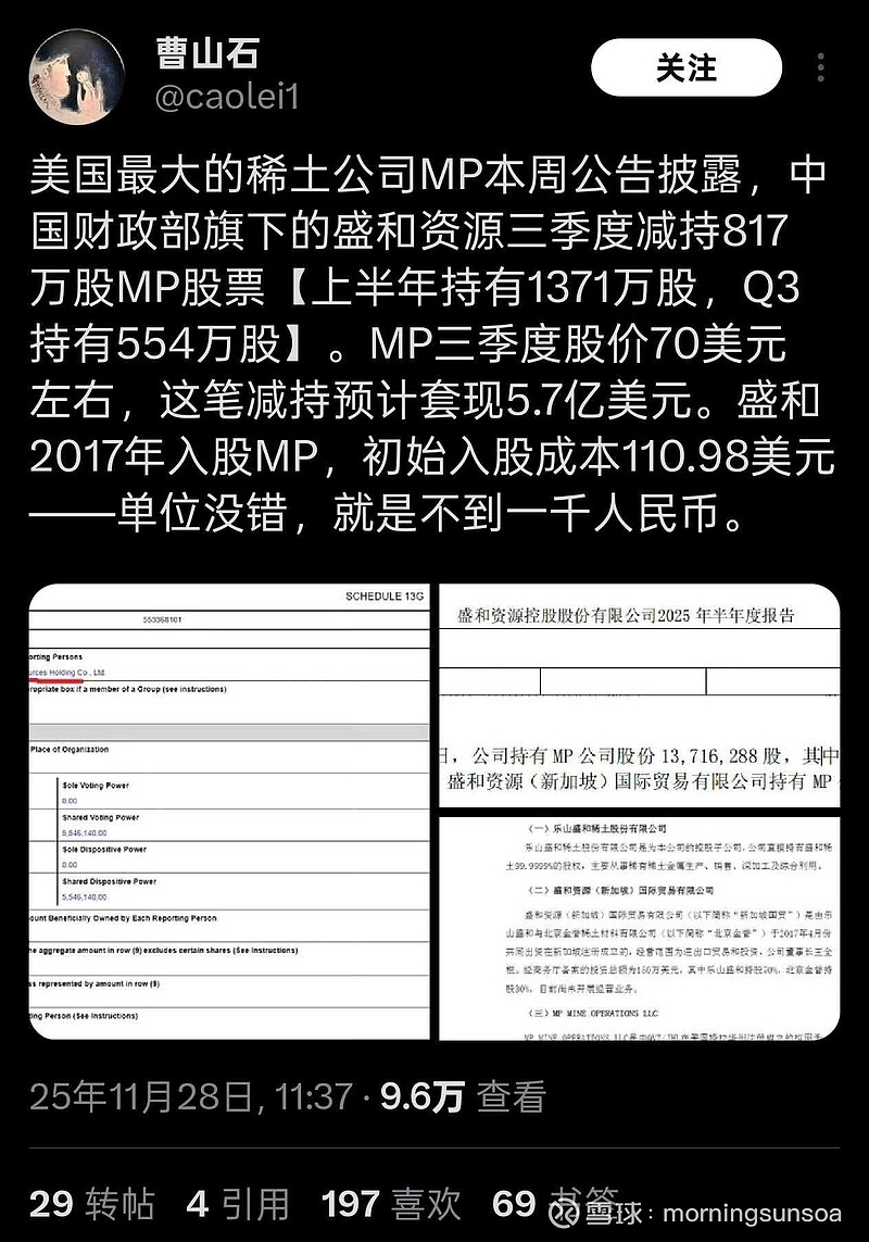 这个算是有影响力的大V了,专门提及盛和资源投资MP的事了,国内的机构反应真是慢。是四五十个亿的投资收益,不是四五个亿。不要说是一次投资性收益的那鬼话,你要看金额有多大,已经大到足以影响公司基本面,也对长期经营形成重大利好。都二十一世纪了,生产盈利赚钱是一种能力,投资盈利也是能力,都是钱,没有差别,关键是你要有这种能力。