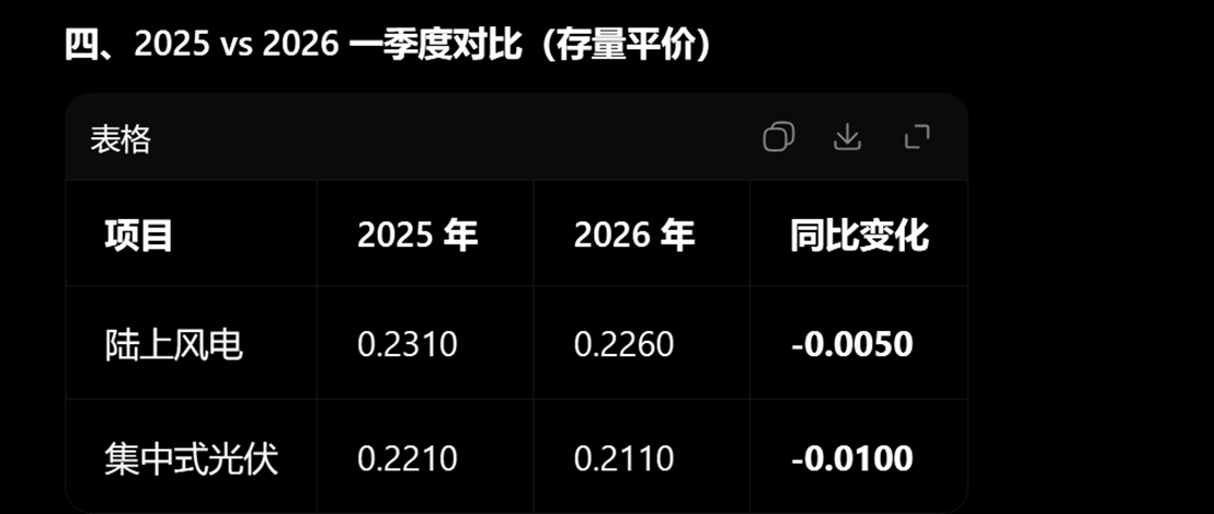 实际上网结算价格:光伏小幅下跌,风电大致持平。