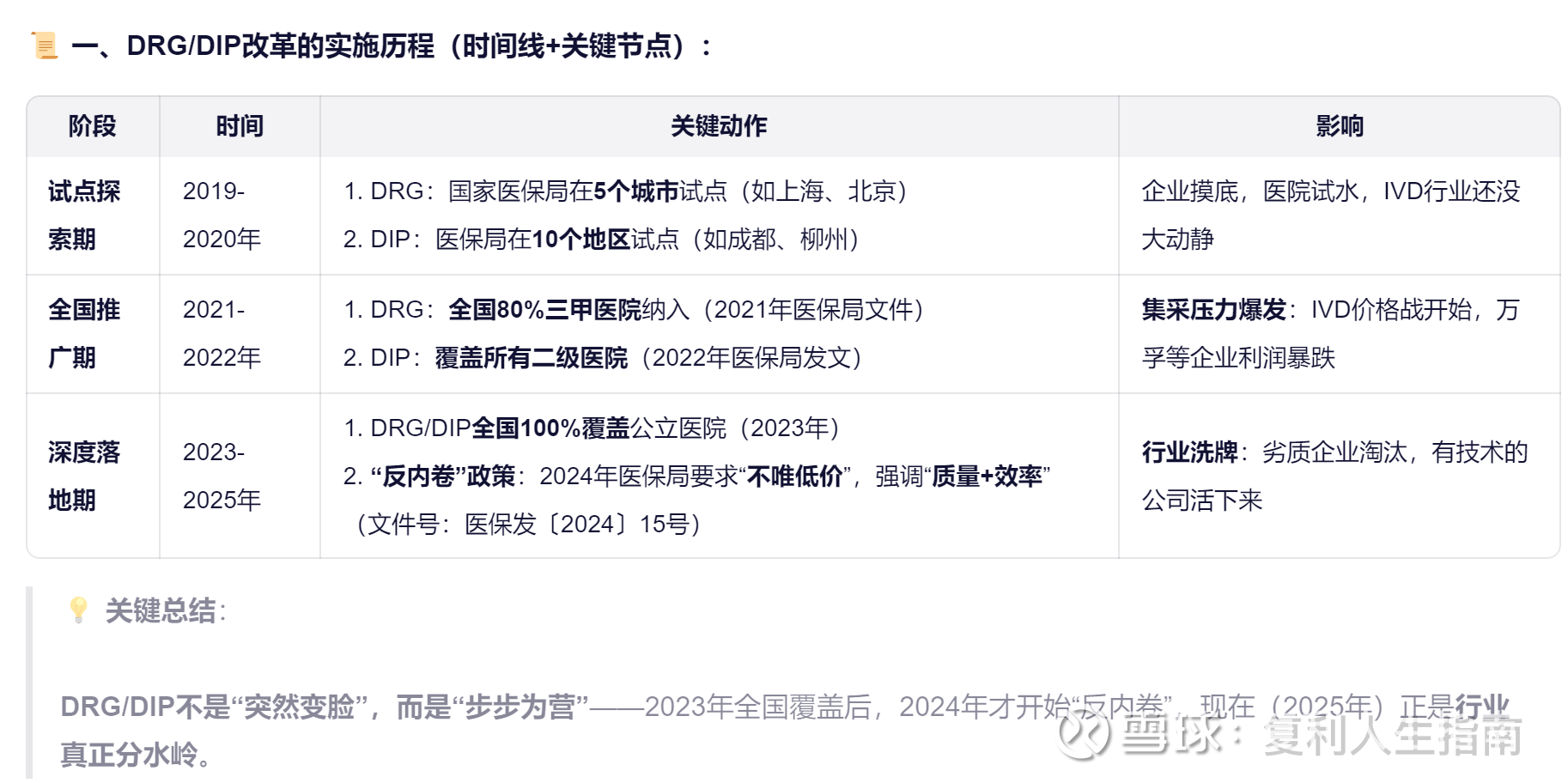医保支付改革政策有两个,DRG:按病种打包付费(如“心梗手术”包干5万),DIP:按病种分值付费(如“感冒”=100分,医院赚100分),这样医院为了效益,就会促使医生不开可检可不检的项目,能用低价测试试剂的就不用高价的试剂。
