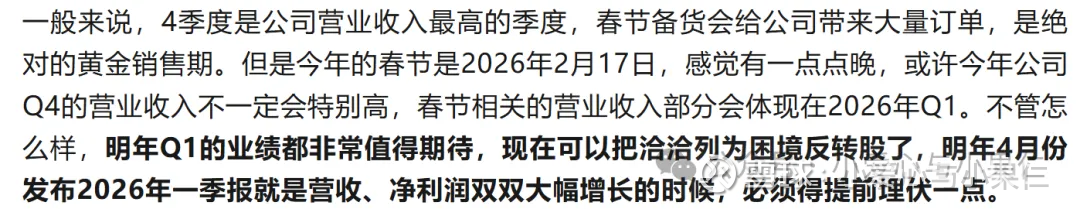 2026年春节比较晚,完整的旺季备货都体现在一季度。而且今年春节法定假期9天,消费时间窗口比往年长。收入增长带来的规模效应,也会对毛利率有正面影响。
