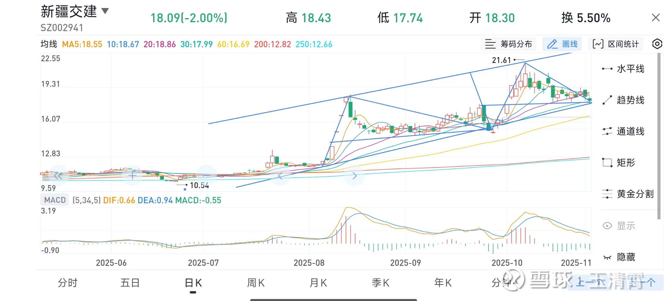 大盘站上4000点后已完成今年目标任务,11月份大概率3900-4000点来回震荡。科技高位回调,银行红利拖指数,这时候的操作策略应放在题材股上。最近福建和海南板块表现最为突出,相信福建和海南的东风会慢慢吹向新疆。新藏铁路是仅次于雅江水电站的国家重点工程项目,新藏铁路新疆段在11月份将会开工建设。这是市场绕不过的重大题材。下图是新疆交建的技术走势,股价运行到了上升通道的下轨叠加新藏铁路11月开工的消息,可能会随时反弹。