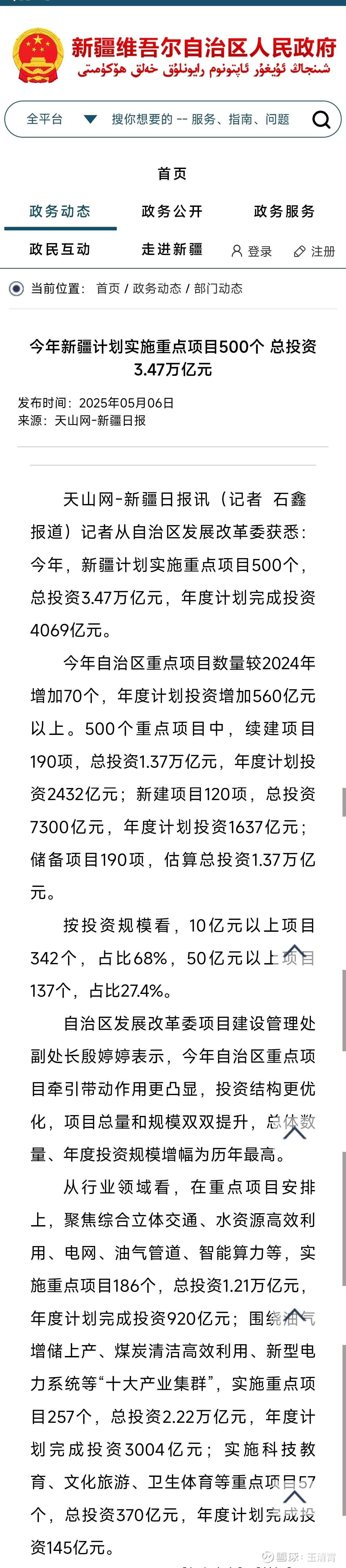 今年,新疆计划实施重点项目500个,总投资3.47万亿元,年度计划完成投资4069亿元。