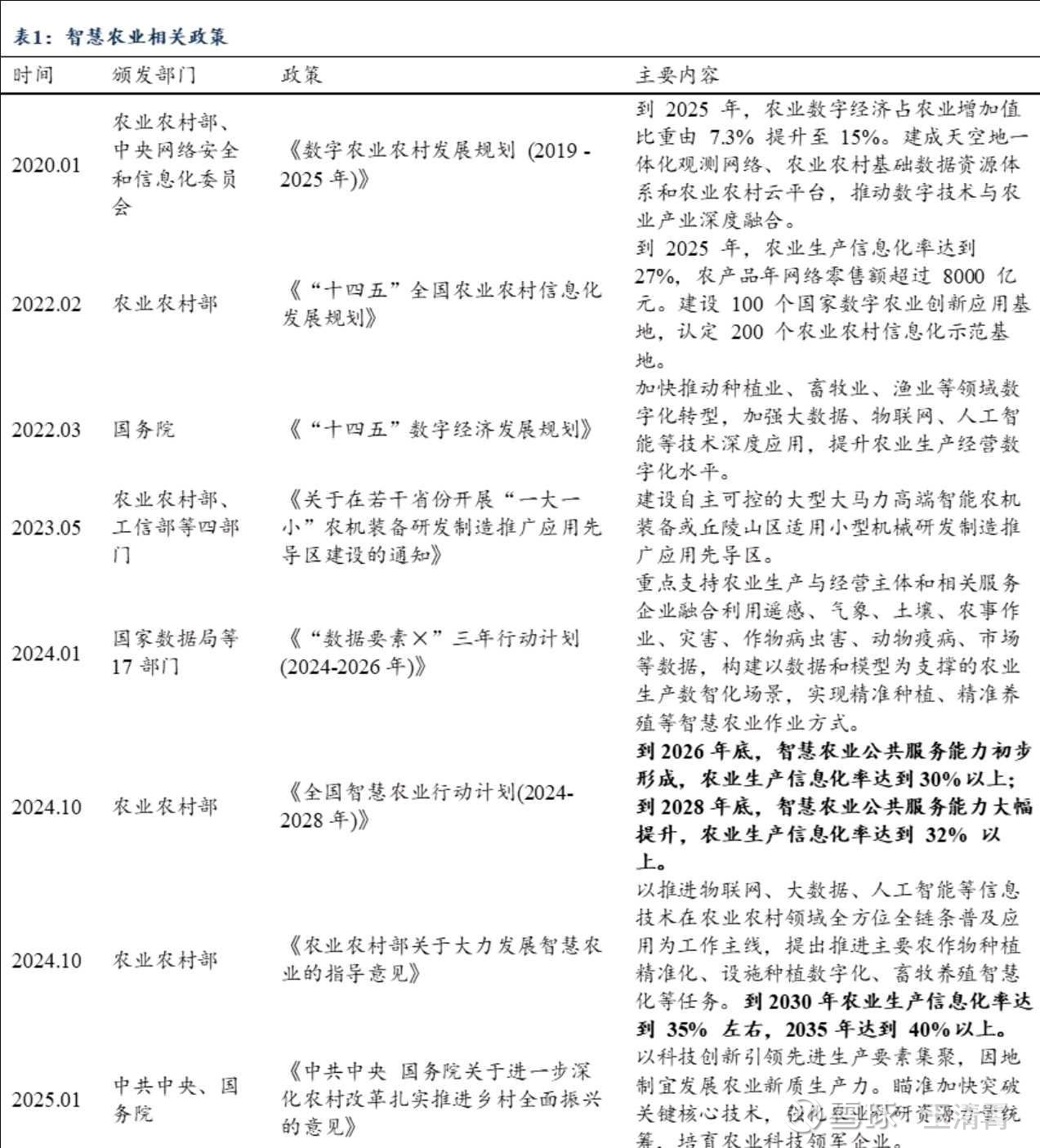 政策红利:2025年中央一号文件首次提出“发展农业新质生产力”,明确将智慧农业作为农业现代化核心战略,财政补贴向AI+农业、智能装备倾斜。