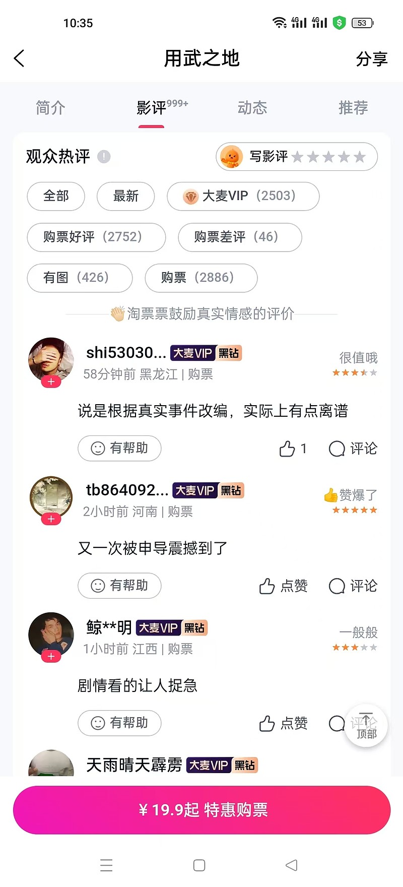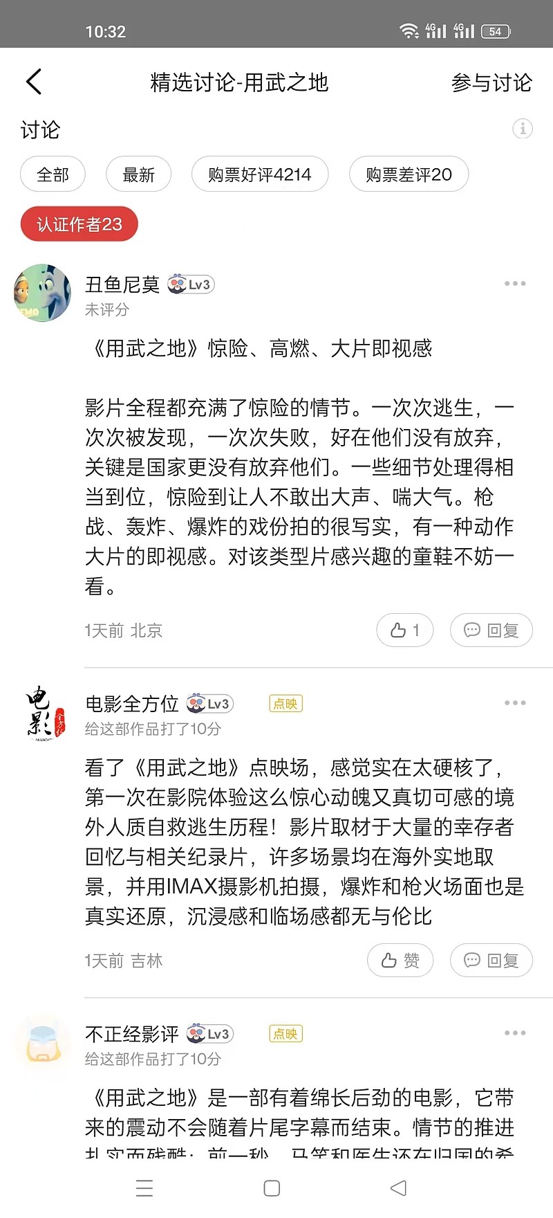 $北京文化(SZ000802)$ 现在用武之地最大的原罪就是极致的冷档期、演员没啥号召力、现在大家不愿意掏钱出来。但从从路人的口碑来说 这个片子口碑是很好的, 但就像孤注一掷被很多人骂觉得剧情不合理、演员演技比较尴尬一样 。不妨碍路人喜欢 毕竟大部分路人 阅片量 没有天天关注影视的人那么多。 所以只有等口碑慢慢发酵、如果有话题就可能暴,没有话题就是一个合格的路人喜欢的商业片。
