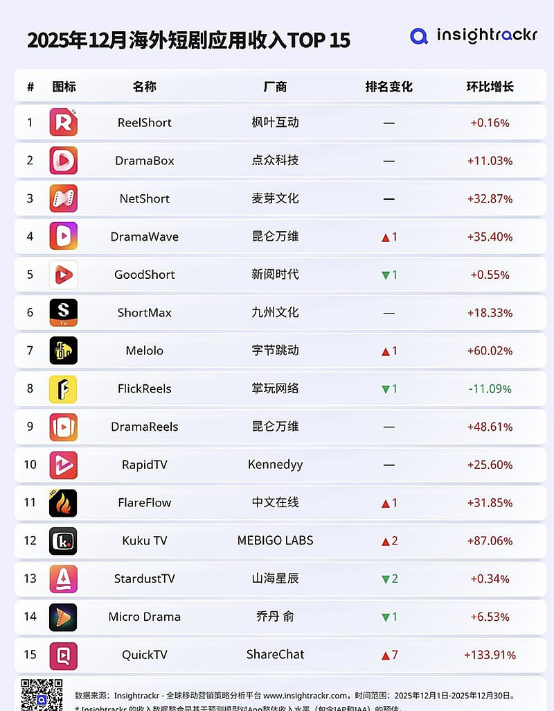 中文12月份出海短剧枫叶互动排第一, f lareflow 第11收入环比上月增长32%。 1月份可能就有两个出海厂牌出现在海外短剧前十了。