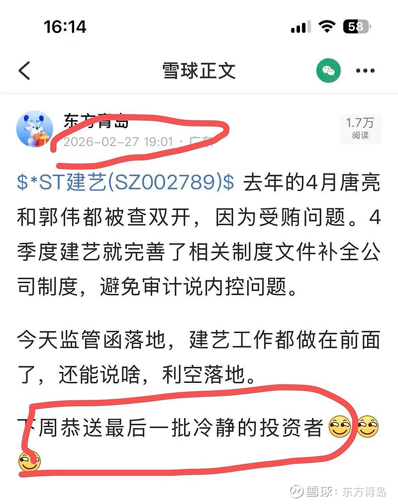 $*ST建艺(SZ002789)$ 回头看看之前的这个预判,还是可以的,最后一周的洗盘,人性如此脆弱……还是以前的观点:不要涨了就盲目,不要跌了就脑补利空,最终看预期面有没有变化,买入的逻辑还在不在,客观的事实是否有根本性的变化!如果没有就安心持股,至于最后看不看底牌,你我皆黑马各有各的判断
