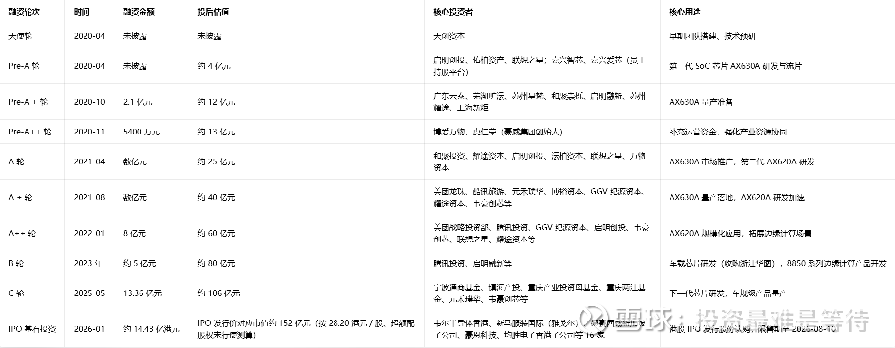 很多朋友看到亏损,再加上PS,认为估值太高,事实上,对于一家在这么多热门领域占据靠前竞争位置的芯片企业,这个估值并不算高。再看下公司的融资历程,最近一次2025年5月按106亿元融资13亿元,除了政府引导基金,也有元禾这类市场化机构。