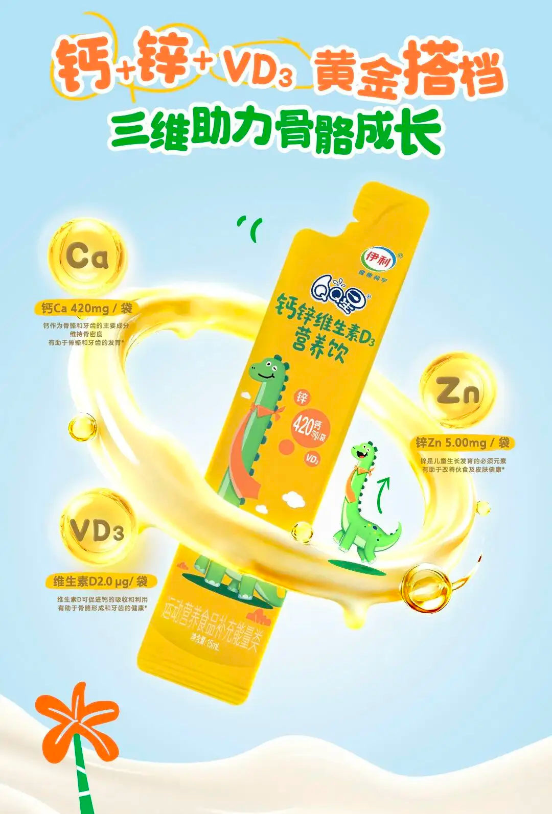 今年两会期间,政府工作报告锚定“十五五”目标任务,将健康中国建设摆在突出位置,明确推进“一老一小”服务等重点工程,为全民健康保障体系建设划定清晰路径。作为健康食品企业,多年来,伊利始终以“成为全球最值得信赖的健康食品提供者”为愿景,紧紧围绕“以消费者为中心”,开展全方位创新和全场景布局。伊利QQ星钙锌维生素D3营养饮主要面向4-10岁的孩子,这一阶段,孩子在上幼儿园或小学,正是身高发育关键期。