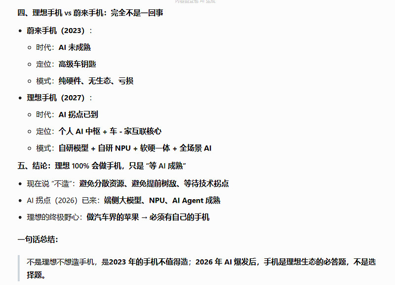 $理想汽车-W(02015)$ 投资理想的必须知道 一件事,手机是一定会造的。因为下一代手机是AI手机,眼镜既然试水了,不可能不造手机。对于理想来讲这是必答题, 不是选择题。既然眼镜已成实事,手机那是藏都藏不住 ,怎么否认都没有用的事了。ov如果不扩展到更多的领域,以后的路也很难走。不然你说你具身智能不造AI手机。。这就是一个笑话。只是2027之前AI眼镜没有走出地位之前,造了不如不造。所以李想才说不造手机,这和当初他说mega造型不会长那样一个道理 。