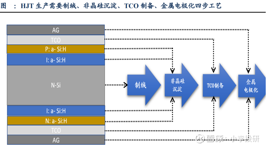 HJT电池的生产工艺相对简单,只需要4大类设备:制绒清洗设备、非晶硅沉积设备、透明导电薄膜设备和印刷设备,分别对应制绒、非晶硅沉淀、TCO制备、金属电极化4步工艺。