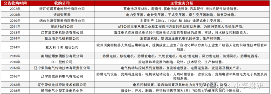 2016年,公司收购辽宁荣信传动,2018年收购美国通用电气小型工业电机业务。