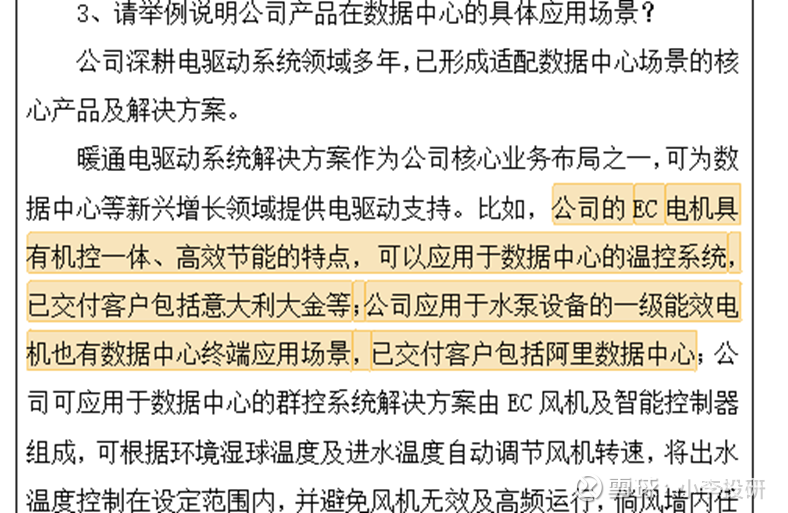 而公司的EC电机具有机控一体、高效节能的特点,可应用于数据中心的温控系统,已交付客户包括意大利大金等;公司应用于水泵设备的一级能效电机也可应用于数据中心场景,已交付客户包括阿里数据中心;