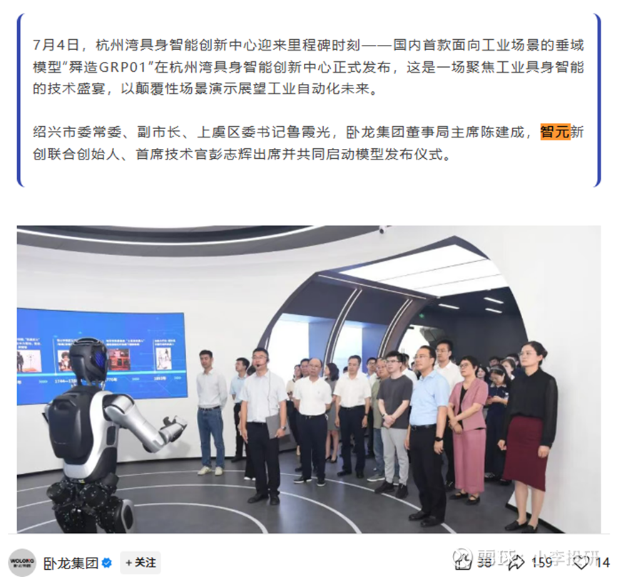 今年7月4日,公司还与智元共同启动国内首款面向工业场景的垂域模型“舜造GRP01”的发布仪式。