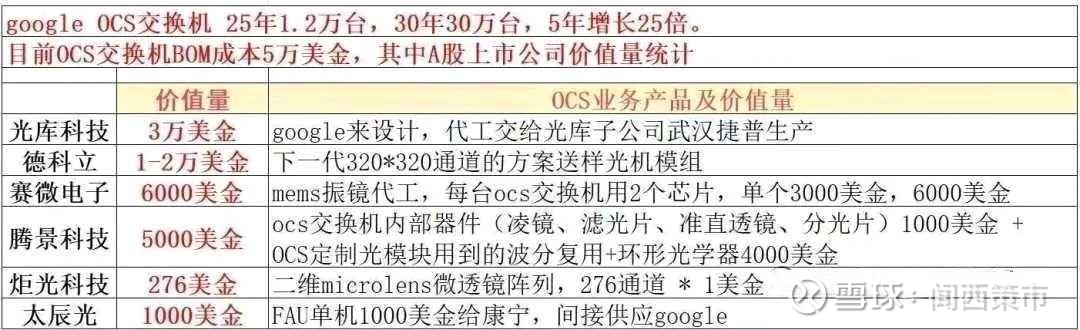 先讲大叙事,OCS交换机是和CPO/OIO并行的终局技术方案选择,可能会呈现双分天下的格局。大客户偏好,谷歌坚定站队OCS,Meta有倒向OCS的趋势,AWS和微软可能对CPO方向兴趣更大(考虑到NV有送样);方案商,NV对CPO和OCS都有布局。