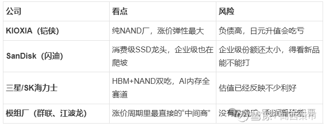 总结:AI让NAND从白菜价变成紧俏货,现在才刚热身,2026年才是真正的涨价年。关注云厂商订单、厂商业绩发布会,以及扩产新闻,一旦扩产潮出现,就是撤退信号。