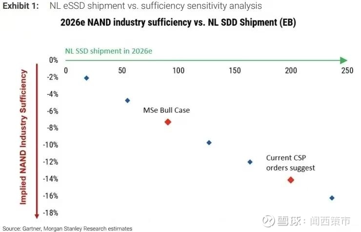 A: 在正常的季节性节奏下,次年订单的谈判通常于10月或11月启动。然而今年,云服务商(CSP)因预期AI推理需求及HDD供应紧张,提前启动了谈判。AI相关需求——剔除中国后约150 EB——与我们的基础情景基本一致。比预期更快的是近线SSD(NL eSSD)订单量,四大客户合计已约200 EB。现阶段重复下单确需警惕,NAND供应商亦保持谨慎。正因如此,我们将2026年位元供应增速由17%上调至21%(基于最新美国WFE模型),牛景仅假设NL eSSD出货90 EB,便已意味着2026年供应缺口7%。若订单再上修,供应商议价能力将更强。