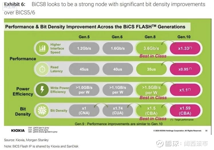 但我们认为多项因素支持该降本幅度:首先,向BiCS8转换是核心动力,该节点位元占比预计由目前中个位数升至未来四季度40-50%。虽难以精确量化,但部分材料显示位元密度提升50%。粗略而言,若一半产量成本降50%,整体成本降幅约25%,方向支持我们的假设。其次,分拆前长期模型目标年降本15%,故17%并不过分。此外,当前产品多仍基于BiCS5,BiCS6较浅,为改进提供更高基数。综上,我们2025年预估为与去年持平,2026年迎头赶上;剔除一次性费用后,2025年每位元成本实际降约5%,使2026年同比17%降幅在正常化基础上约14%。