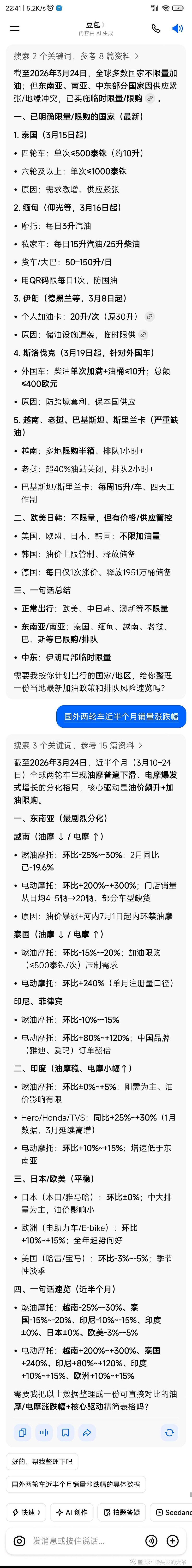 发张图。国外不少地区已经限量供油。电摩销量爆发。已经有地区卖断货了。除了欧洲和美洲,在国外能买的起比油车还贵的比亚迪的人超过1%吗?那么剩余的人买什么?没钱买什么?跑外卖买什么?这么爆发的需求这么大的全球市场。还有涨价预期,几十亿人。仔细想想。$比亚迪(SZ002594)$$久祺股份(SZ300994)$$爱玛科技(SH603529)$两轮车除了涛涛九号雅迪和久祺,其他公司国外占比不大。涛涛主攻欧美市场,美国不怎么缺油,缺电。九号没这么研究。