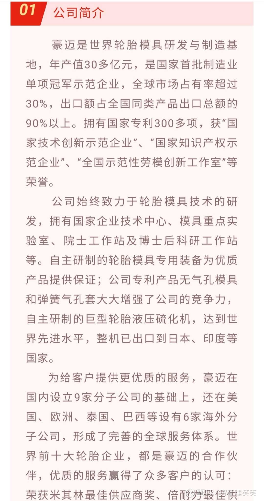 看点一:豪迈科技的第一成长曲线轮胎模具业务目前已是全球相关行业冠军,全球市场占有率超30%。十年后随着外部竞争对手的持续出清产能退出和轮胎巨头自有模具厂商的产能不断转移,豪迈科技的轮胎模具业务能否达到40%甚至50%的全球市场占有率,届时营收约80亿,净利约20亿?