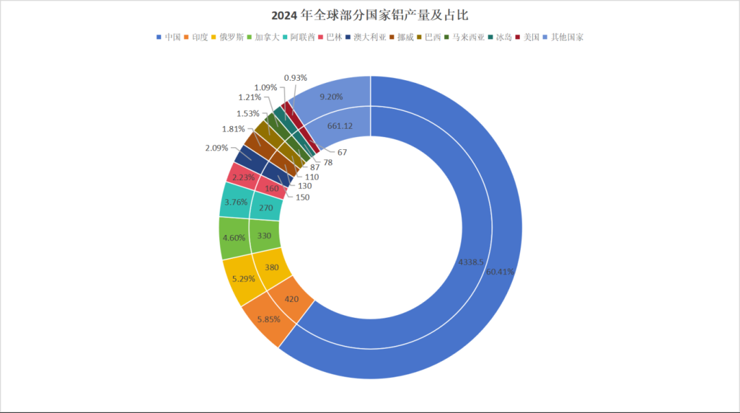 中国以4338.5万吨的产量遥遥领先,占全球总产量的60.41%,已连续24年蝉联世界第一铝生产国。