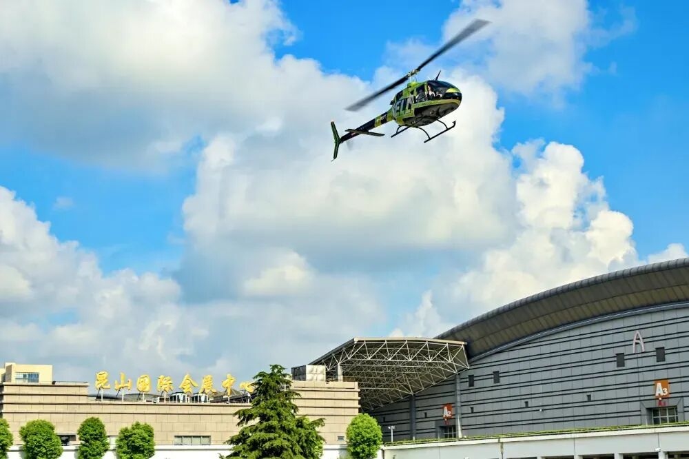 昆山国际会展中心上空的直升机,当地的低空经济产业炙手可热