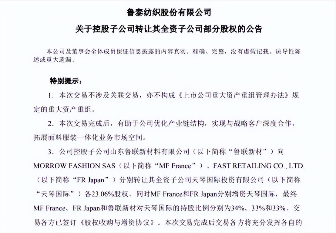 三家合资持有一家叫做“天琴国际”公司的股权,晨风、迅销、鲁泰分别持股34%、33%、33%。