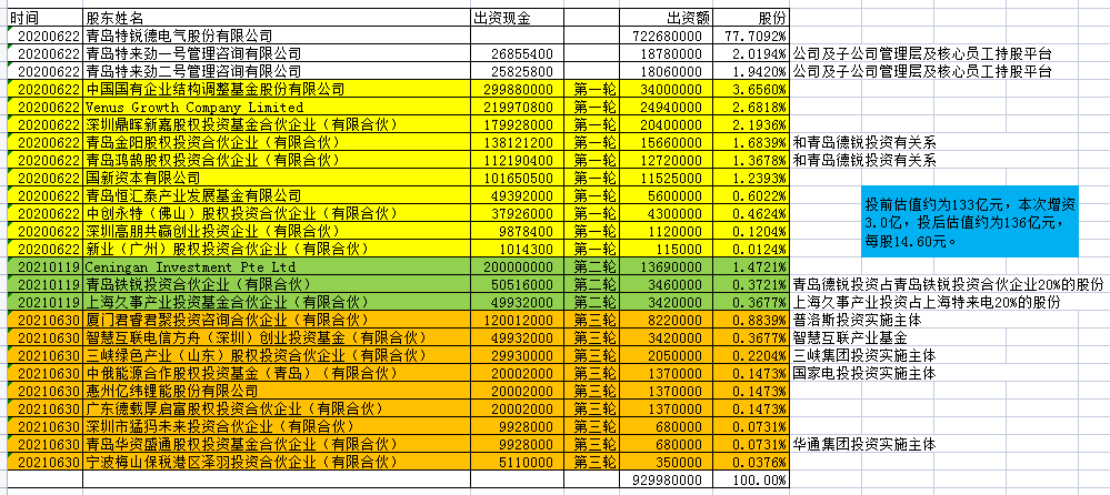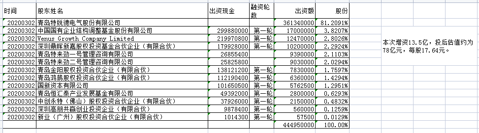 然后就是2020年03月02日,特锐德关于特来电增资扩股暨引进战略投资者的进展公告里面写明了,特来电已收到1130018400元人民币和31386118元美元的增资款,总计约合13.5亿元人民币;并完成相关工商登记变更手续,取得了由青岛市 崂山区市场监督管理局换发的《营业执照》。