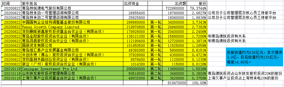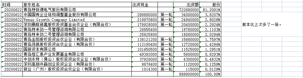 然后就是2021年06月30日,特锐德关于特来电增资扩股暨引进战略投资者的进展公告里面写明了,特来电已收到284846000元人民币的增资款,并完成相关工商登记变更手续,取得了由青岛市市场监督管理局换发的《营业执照》。