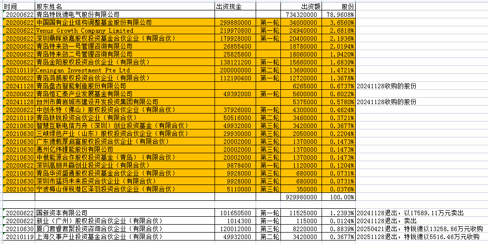 首先是2024年11月28日,国新资本有限公司 和 新业(广州)股权投资合伙企业(有限合伙) 退出,青岛盘古智能制造股份有限公司 和 台州市黄岩城市建设开发投资集团有限公司 接盘。其次是2025年04月21日,厦门君睿君聚投资咨询合伙企业(有限合伙)退出,特锐德接盘。然后是2025年11月28日,上海久事产业投资基金合伙企业(有限合伙)退出,特锐德接盘。