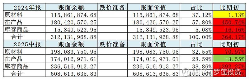 从上图可以看出,截止2025上半年末,公司存货账面价值合计6.09亿元,比期初增长94.99%;从存货结构来看,2024年末,公司存货中在产品占比最大,原材料次之,库存商品占比最小,但是到了2025上半年末,公司存货中的库存商品却成了金额和占比都最大的项目。
