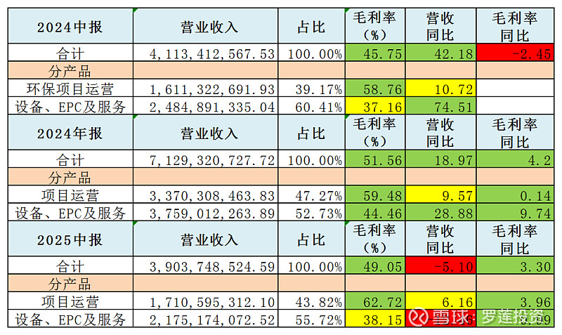 上图是伟明环保2024上半年至2025上半年的营收结构情况。可以看出,公司传统的环保项目运营板块营收仍能保持增长,但增速已逐渐放缓,这基本符合罗莲此前对公司该板块的分析判断。而装备制造板块的营收增速却出现了显著下滑。