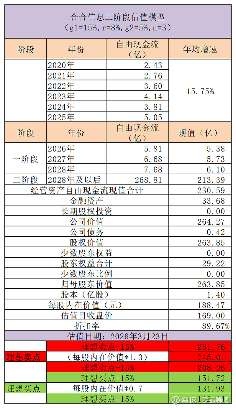 如果将理想买卖点确定为每股内在价值的±30%,则分别为131.93元和245.01元。今日合合信息收盘价169元,相当于每股内在价值打九折的样子,比理想买点+15%还高出一折,真心希望合合信息的股价能借这次调整再跌一跌,打八折时罗莲会考虑开始建仓。