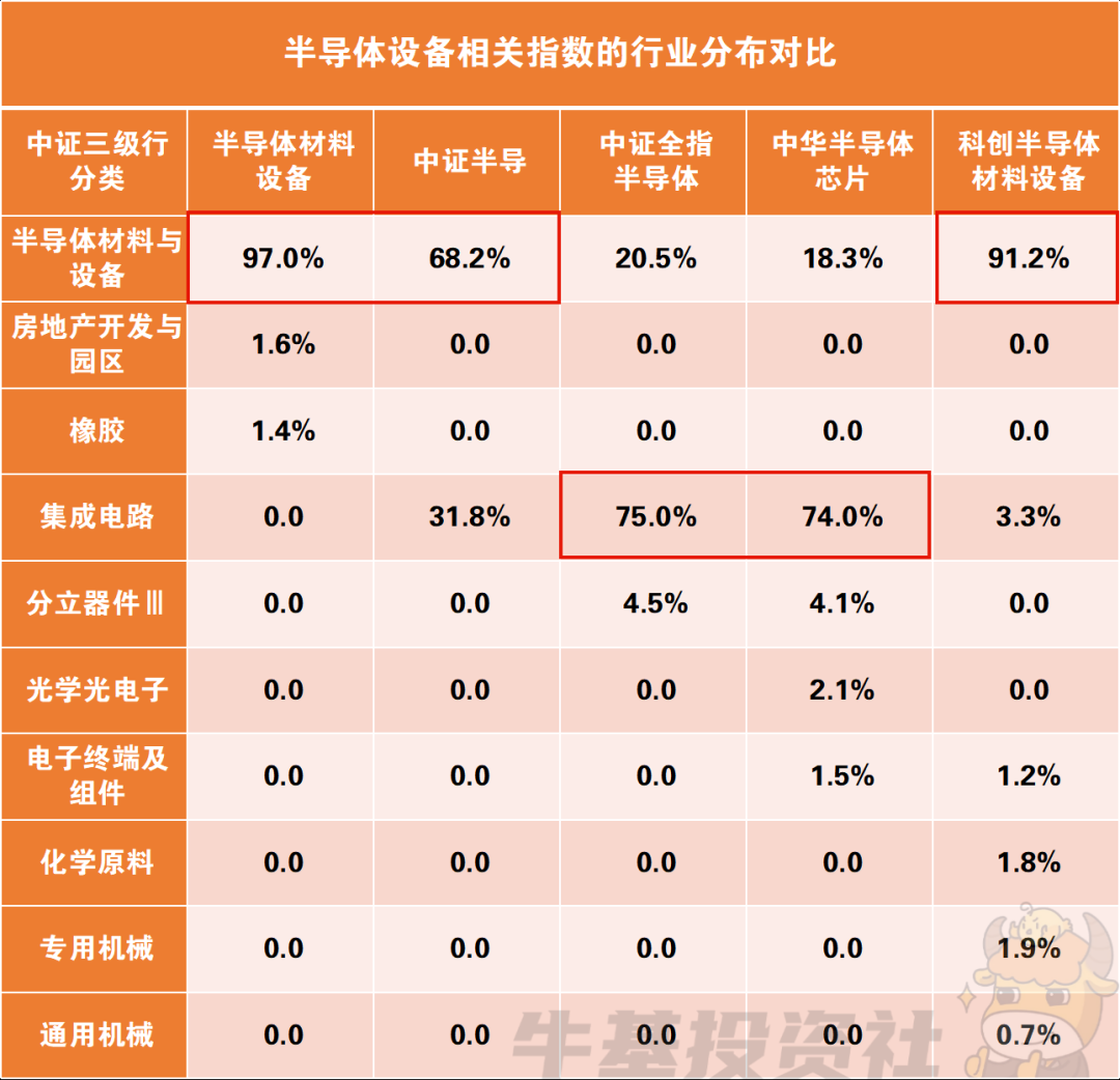 作为对比,中证半导、中证全指半导体、中华半导体芯片等指数,均有较大权重分布于集成电路(如芯片设计、制造等)领域,在设备与材料方向的纯度明显减弱。而科创半导体材料设备指数受选股范围限制,在半导体材料设备行业的占比仅为91%,约近一成的权重被其他行业分散,主题浓度相对较低。
