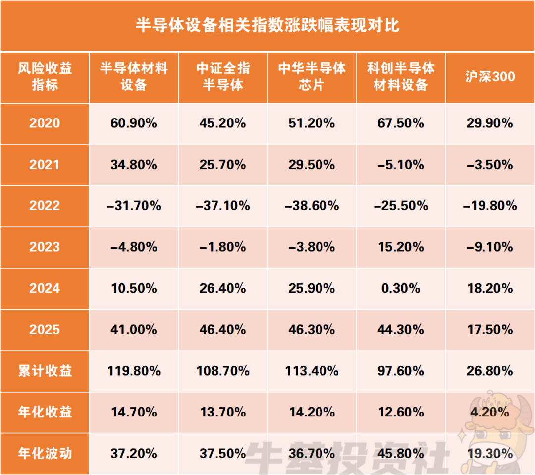 半导体设备相关指数在近几年经历了明显的周期波动:2020年整体大幅上涨,多个指数涨幅在四五成以上;2022到2023年则进入下行阶段,部分年份跌幅超过三成;2024年开始回暖,进入2025年科技主线爆发,半导体设备延续了正增长的势头。整体来看,与沪深300相比,半导体板块的波动幅度较大,但其收益空间自然也更大。
