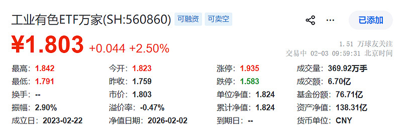$工业有色ETF万家(SH560860)$ 现涨2.50%。