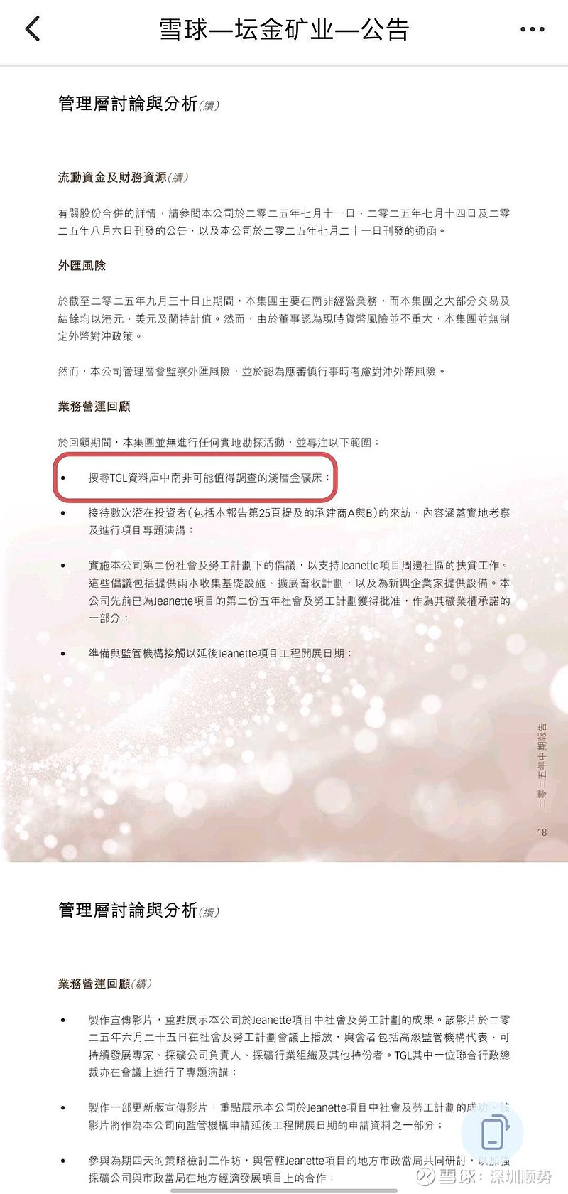 $坛金矿业(00621)$ 提示一下,去年的中报有一条信息大家没有注意(画红框),就是在J矿浅层金矿床探矿,据说某央企去南非两次尽调,取得了重大突破,可能未来的开采从这里开始,并大幅降低成本。这只是传闻,据比投资,后果自负。