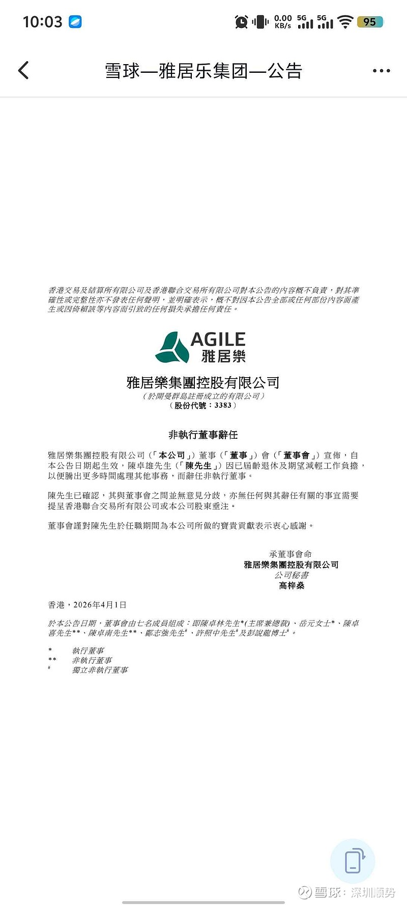 在雅居乐地产处于破产边缘、债务重组迫在眉睫之际,创始人陈卓雄先生却请辞拂袖而去,他心烦了,不想管这个烂摊子了,看着自己多年心血一手打造的企业快死了,此刻哀莫大于心死!我想,陈先生应该尽最大能力拯救雅居乐地产,保住这块招牌,哪怕在债务重组中卖掉宝贵的亲生儿子雅生活服务也在所不惜,否则雅居乐地产只能步恒大后尘去破产清算了,那真的是"恒二”了,脸面丢大了!至于有球友说2025年雅居乐地产揩油雅生活3亿人民币,说实话跟2024年财务大洗澡几十亿比,这3亿人民币算不了什么,这3亿也救不了雅居乐地产,也无法起到起死回生的作用,反而会拖低雅生活的估值,在未来的债务重组中无法卖出高价。雅居乐地产的资产质量非常差,在债务重组中大概率只能卖掉雅生活的股权回笼资金以自救,如果还是不想放手,每年揩油3亿对雅居乐地产帮助不大,反而会两败俱伤!我想,创始人陈老板的离开就是彻底放手了,该卖的资产能卖好价就卖,不会心疼,只要能救活雅居乐地产就行!对雅生活来说,摆上货架就是给一条解脱之道,新东家的到来必然让自己重生,走上康庄大道!!!放手雅生活或者是陈总对雅生活小股东最大的善意,当然,这种所谓的善意也是不得以而为之!!!
