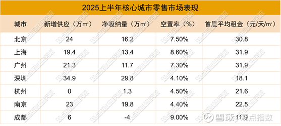 商业市场表现上,2025上半年,核心城市零售市场供应节奏呈现差异化。北京、上海、广州、深圳、南京、成都均有新增供应,其中北京以24万㎡ 、深圳34.9万㎡ 居前,杭州则无新增供应,反映出不同城市商业开发活跃度存在差异。