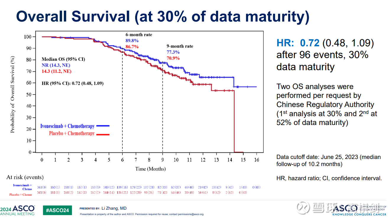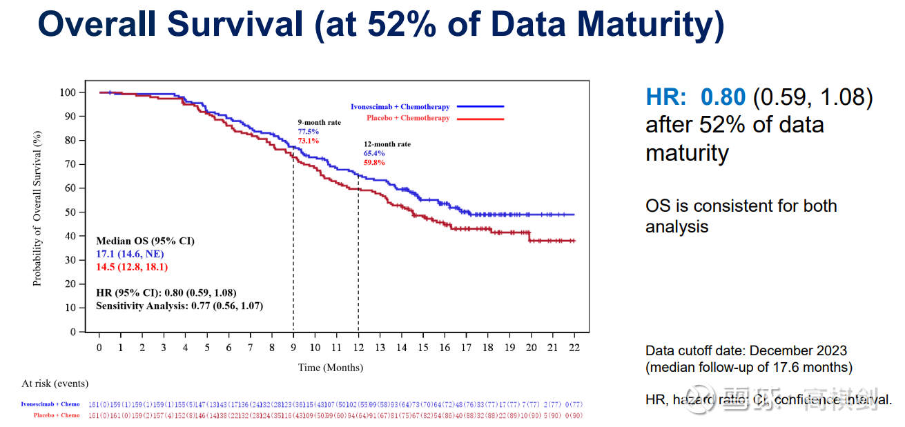 也就是说在30%成熟度时候,AK112+化疗对比化疗,死亡风险下降28%(总样本320,则AK112组死亡40,对照组死亡56),而52%成熟度时,死亡风险下降20%(总样本320,则AK112组死亡74,对照组死亡92),也就是说301试验从30%-52%的成熟度阶段中,AK112组死亡34例,而对照组死亡37例,AK112+化疗在此阶段死亡速率与化疗组相当!